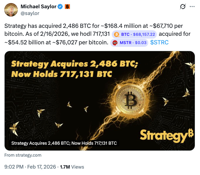 •Strategy acquired 2,486 BTC for ~$168.4M (~$67.7K per BTC)