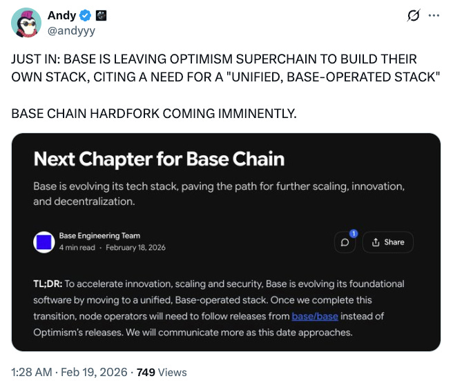 •Base is leaving the Optimism Superchain to build its own unified, Base-operated stack