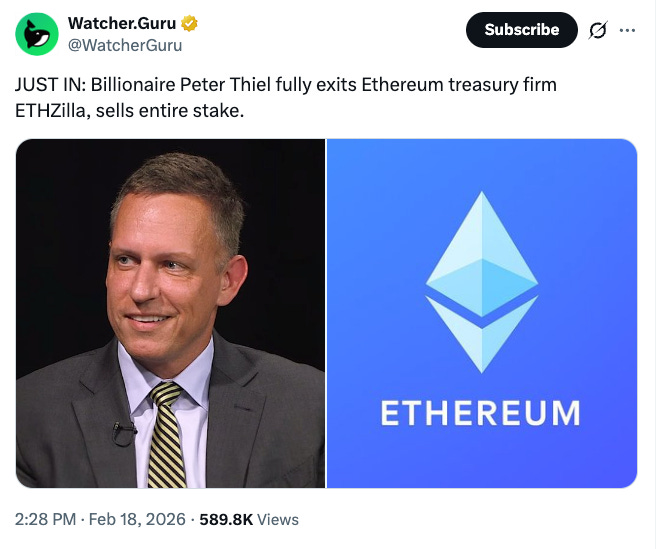 •Billionaire Peter Thiel fully exits Ethereum treasury firm ETHZilla, selling his entire stake