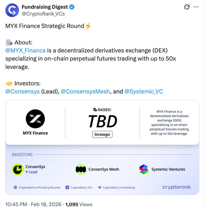 •@MYX_Finance (DeFi) - $TBD Strategic led by @Consensys
