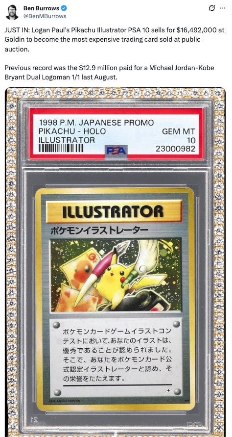•Logan Paul’s Pikachu Illustrator PSA 10 sold for $16.49M at Goldin, becoming the most expensive trading card ever sold at public auction