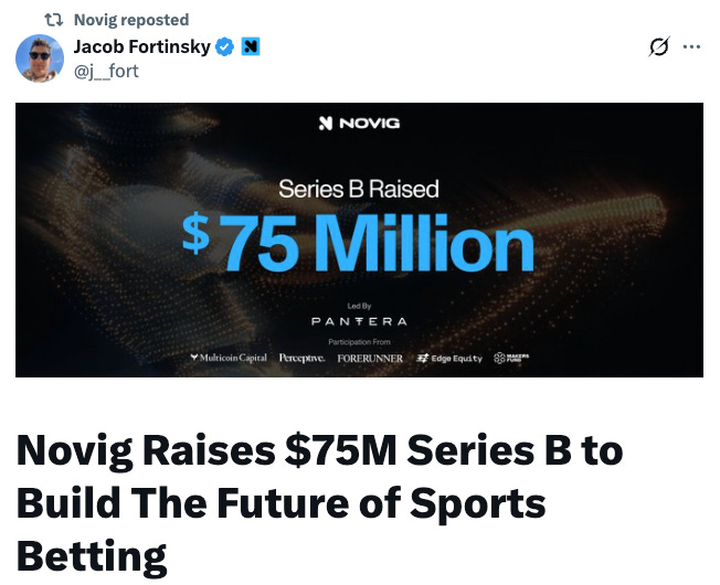 •@Novig (DeFi) - 75m Series B led by @PanteraCapital