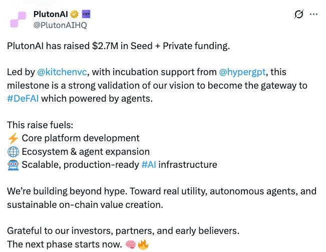 •@PlutonAIHQ (DeFi) - 2.7m Seed led by @kitchenvc