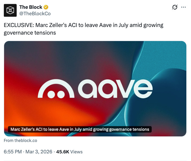 •Marc Zeller’s ACI will leave Aave in July amid rising governance tensions