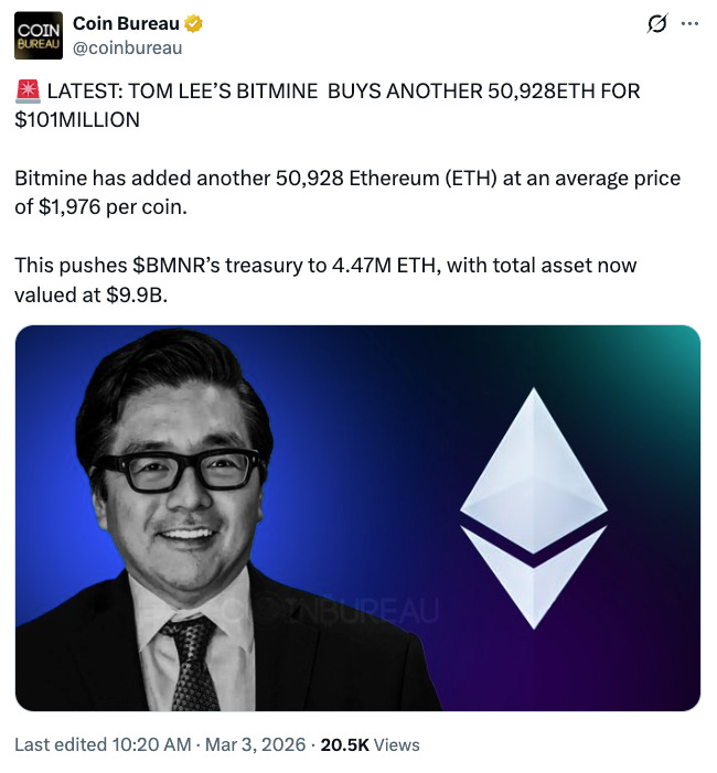 •Tom Lee’s BitMine bought 50,928 ETH for $101M, raising its treasury to 4.47M ETH