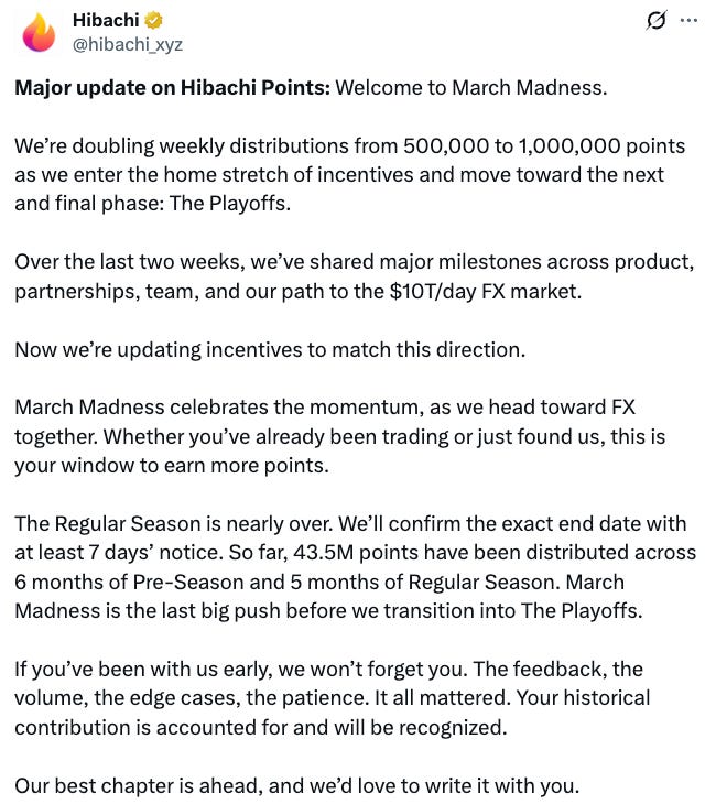 @hibachi_xyz doubles weekly points to 1M for March Madness ahead of the Playoffs