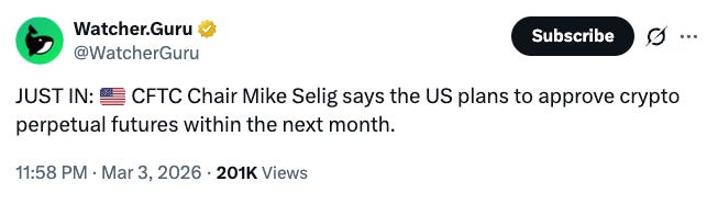 •CFTC Chair Mike Selig says the US may approve crypto perpetual futures within a month