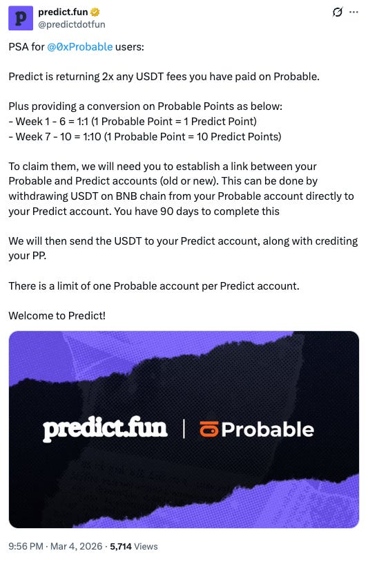 @predictdotfun acquires @0xProbable, offering 2x fee refunds and point swaps for linked users