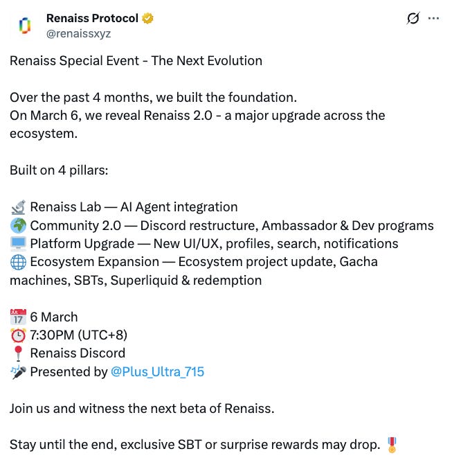 @renaissxyz 2.0 drops March 6 with AI, community, platform and ecosystem upgrades