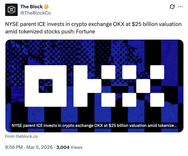 •ICE invests in OKX at $25B valuation amid tokenized stocks push